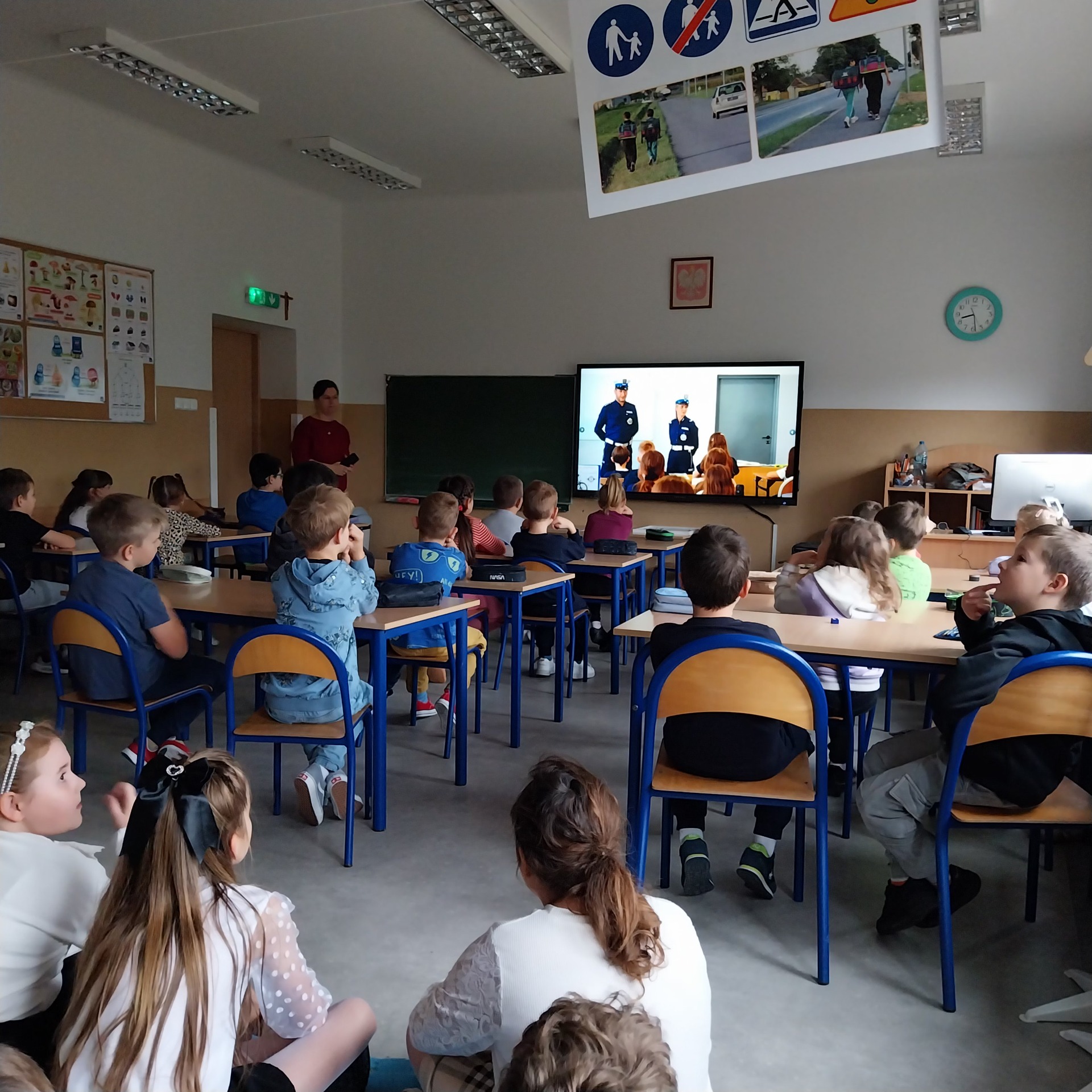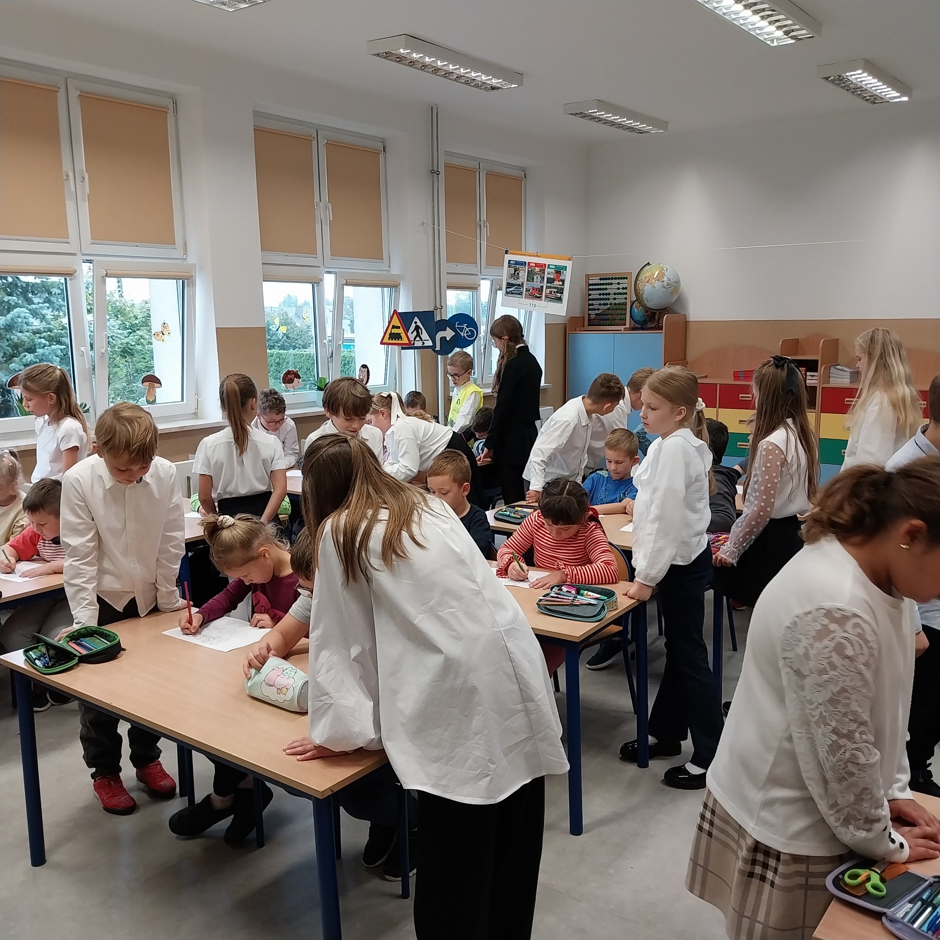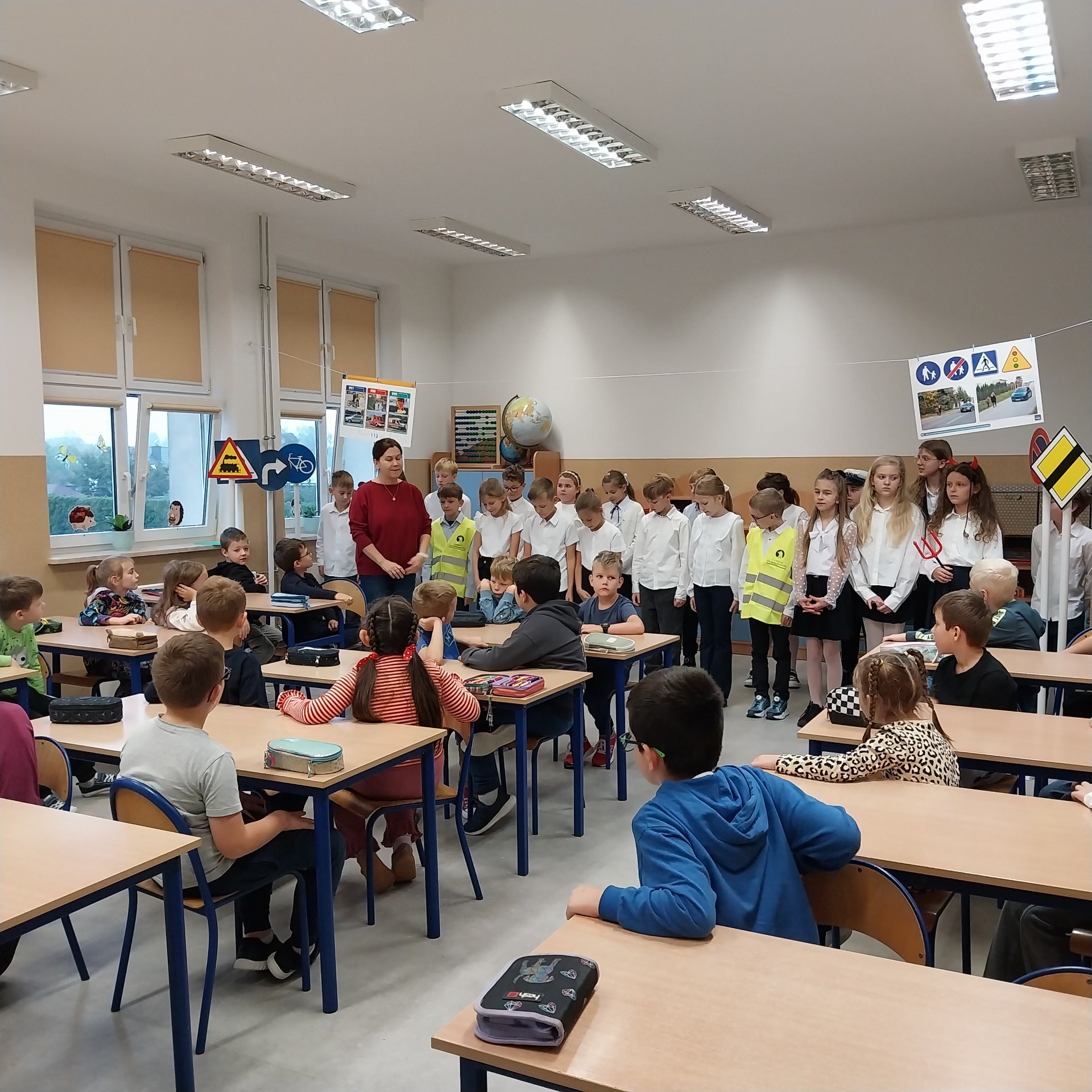 W piątek 10. października 2025 roku klasa 3a zaprosiła na widownię uczniów z klasy 1c, aby przypomnieć młodszym kolegom zasady bezpieczeństwa w ruchu drogowym. Najpierw trzecioklasiści wyrecytowali wiersze i pięknie zaśpiewali piosenki, a potem wraz z pierwszoklasistami wspólnie obejrzeli film przygotowany przez policję. Później wszyscy wykonali kolorowanki z konturami znaków drogowych. Pierwszoklasiści otrzymali od starszych kolegów i koleżanek prezenty: kamizelki odblaskowe i opaski. To była wyjątkowa lekcja!