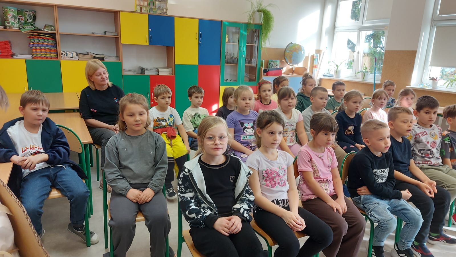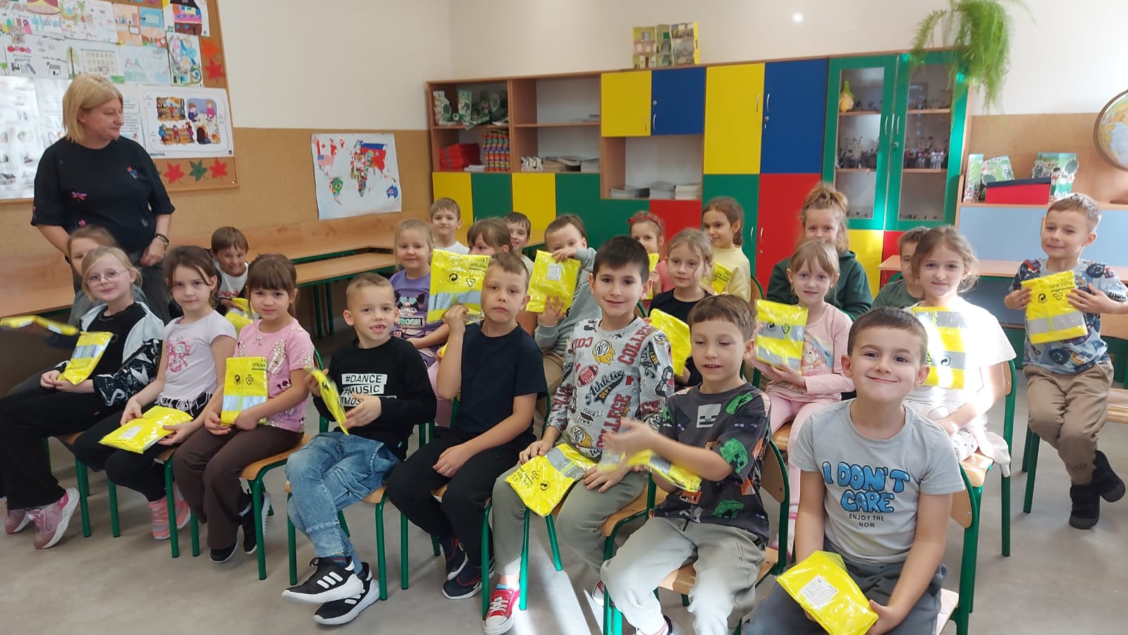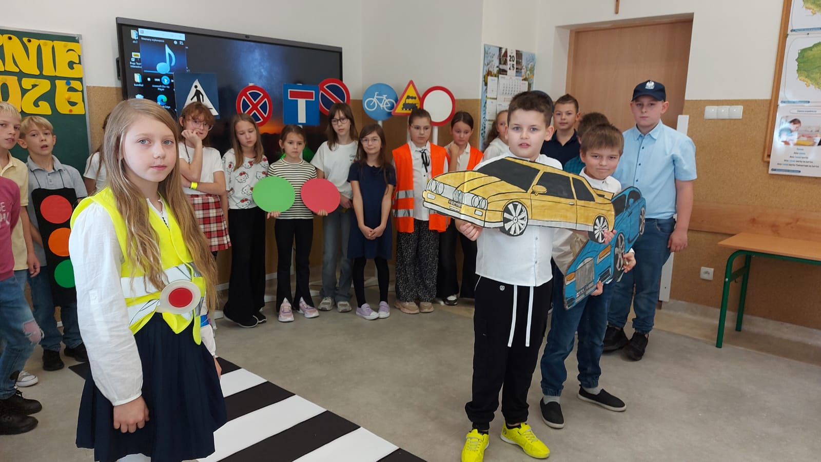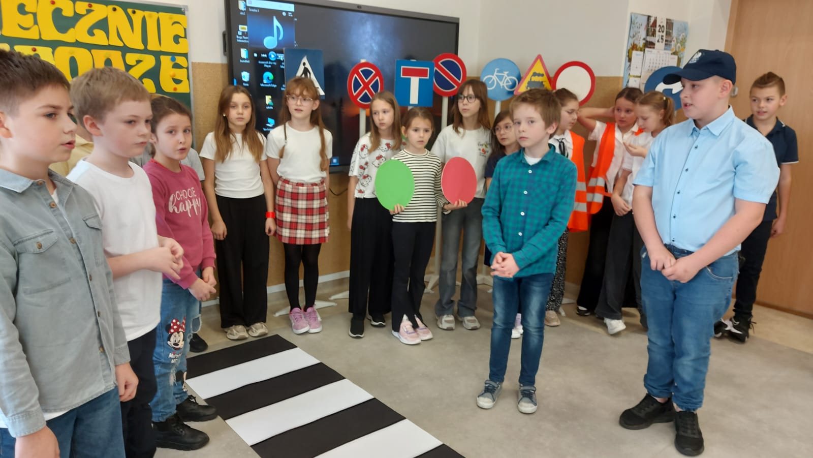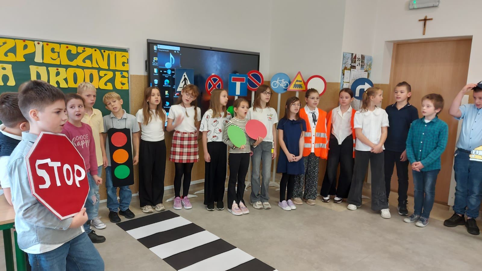Uczniowie klasy IIIb chcąc zadbać o bezpieczeństwo młodszych koleżanek i kolegów z klasy pierwszej przygotowali inscenizację pod hasłem "Bądź bezpieczny na drodze".Poprzez wiersze i piosenki trzecioklasisci wskazali zaproszonym małym gościom właściwe zasady zachowania w ruchu drogowym. Przypomnieli o przestrzeganiu ustalonych reguł dotyczących poruszania się na drodze. Pierwszaki w skupieniu obejrzały występ i z uwagą wysłuchały rad. Dla utrwalenia drogowych zasad ucz.kl.I otrzymali kolorowanki z hasłami przypominającymi właściwe zachowania w ruchu drogowym. W trosce o bezpieczeństwo starsi koledzy wręczyli pierwszoklasistom kamizelki odblaskowe.