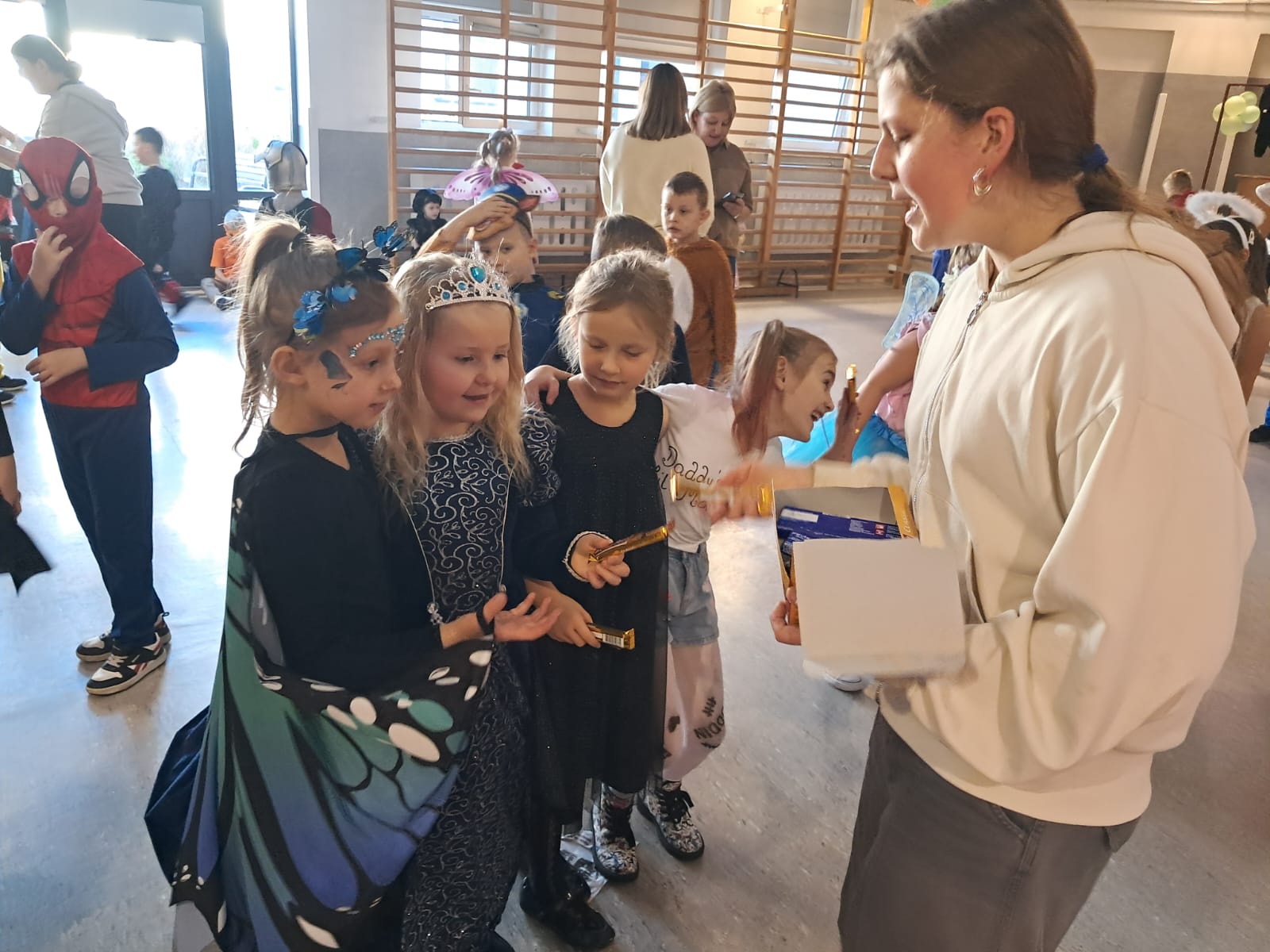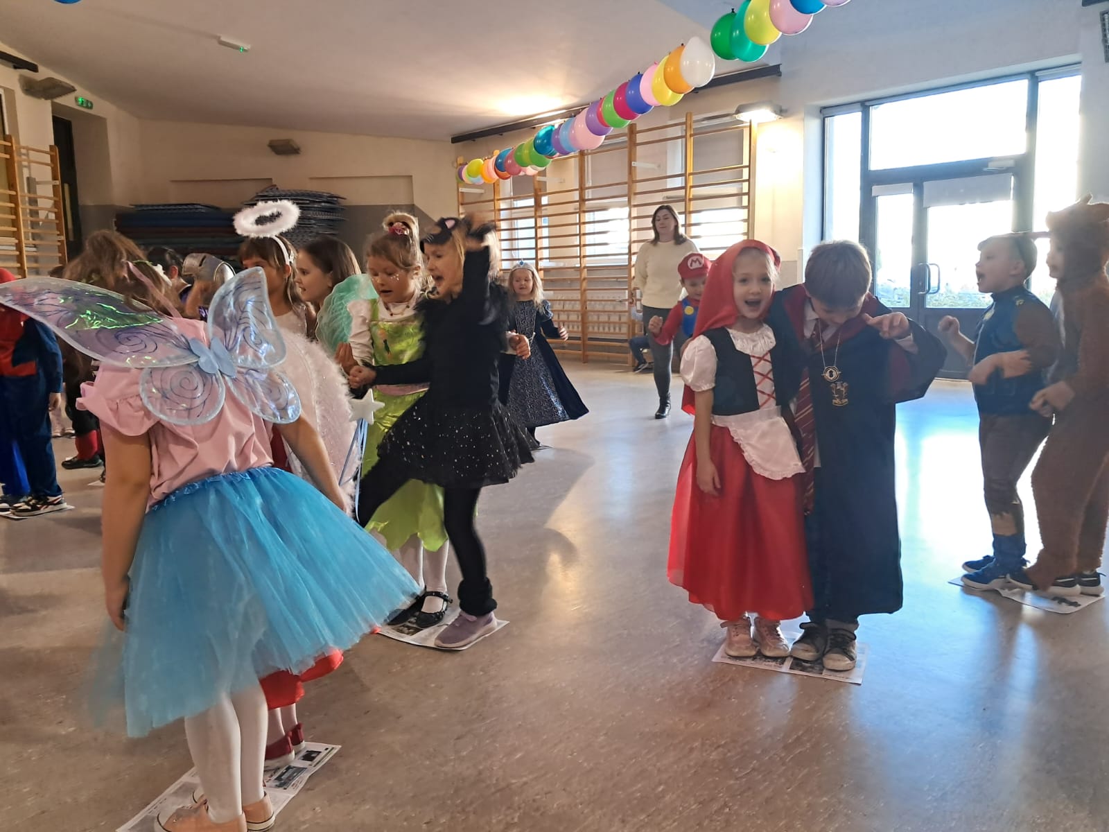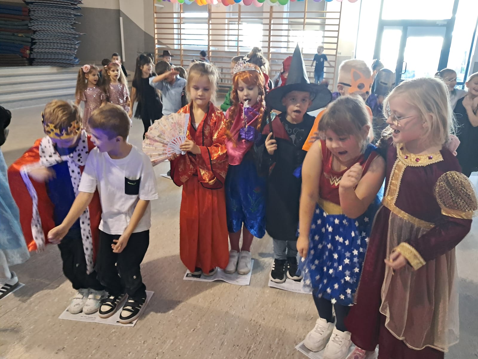 Wspólne tańce, konkursy i zabawy z niespodziankami - takie było integracyjne szaleństwo 6 listopada 2025 roku klas pierwszych, zorganizowane przez Samorząd Uczniowski, który dołożył wszelkich starań, aby ten dzień był wyjątkowy. Podczas balu przenieśliśmy się w bajkowy, niezwykły świat za sprawą barwnych strojów pierwszoklasistów. Młodzi uczniowie bawili się do ulubionych utworów muzycznych oraz chętnie uczestniczyli w konkursach i zabawach przygotowanych przez przedstawicieli Samorządu Uczniowskiego. Wspólne konkursy i tańce zintegrowały wszystkich uczestników balu, a spotkanie na tanecznym parkiecie umożliwiło dzieciom spędzenie czasu w miłej atmosferze. Dziękujemy za dobrą zabawę, spontaniczność i uśmiech. Na koniec każdy uczeń otrzymał słodki upominek.