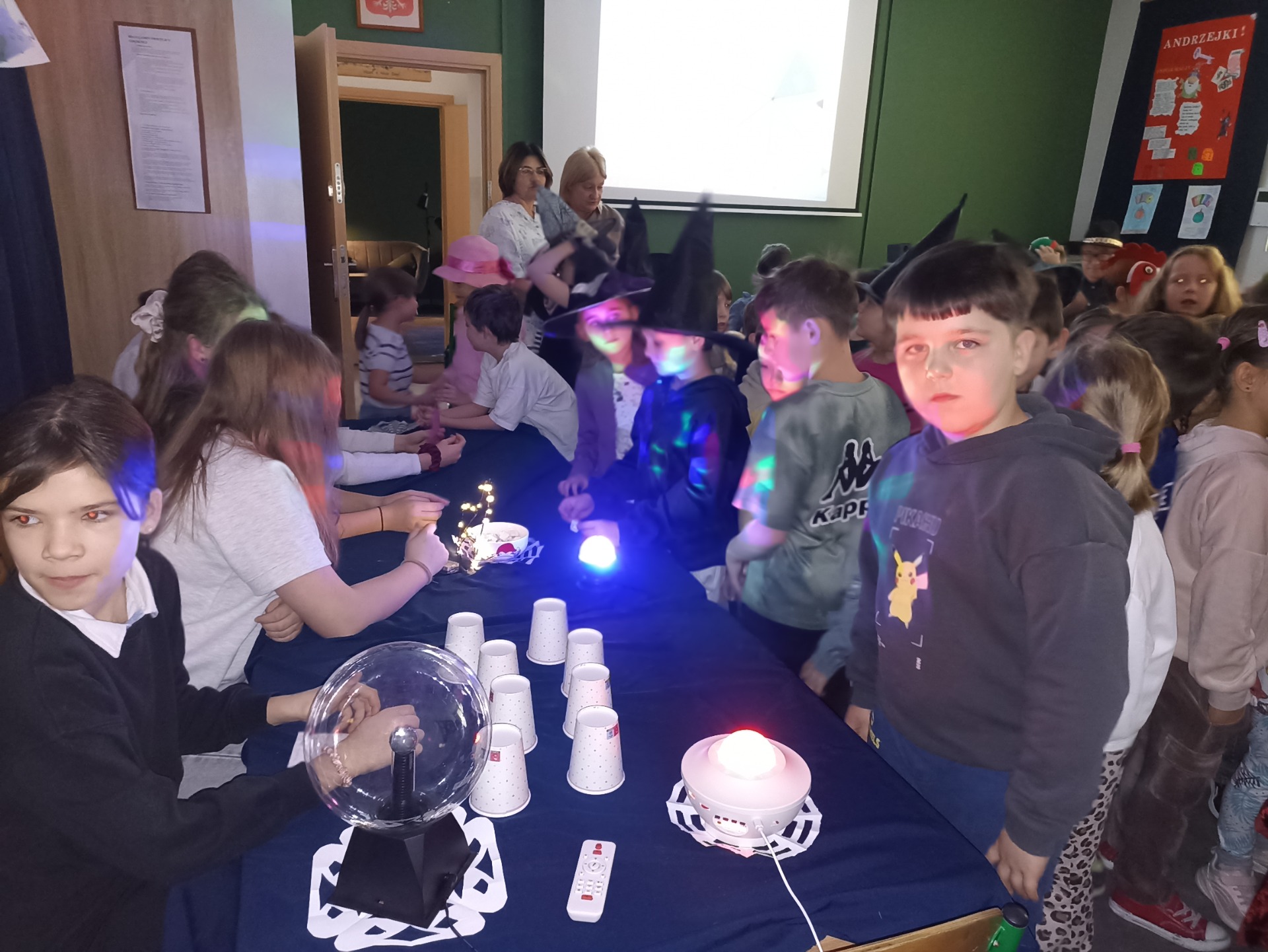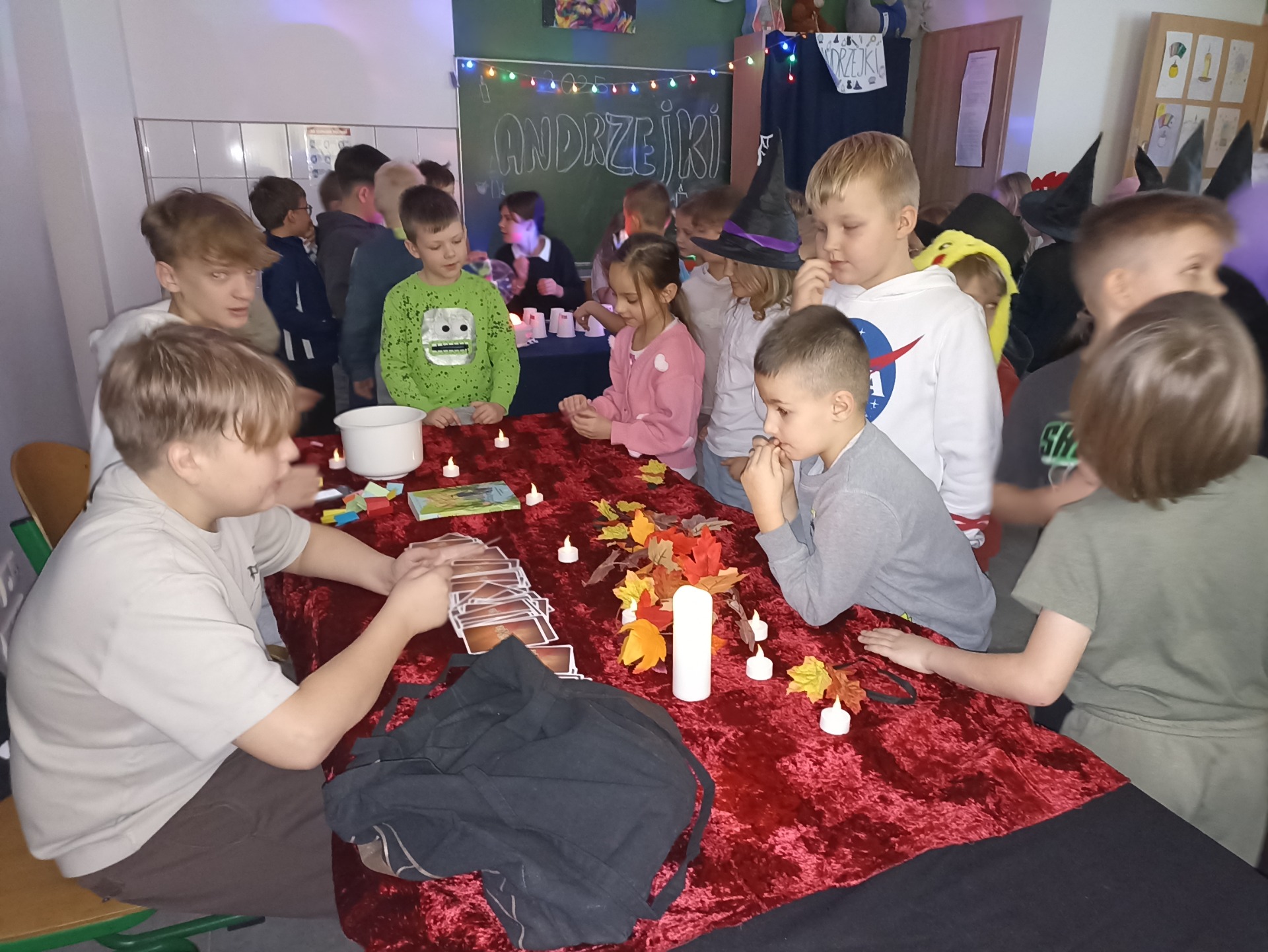 W świetlicy szkolnej 28.11.2025r. świętowaliśmy andrzejki. Świetlica Szkolna i Samorząd Uczniowski przygotowali stoiska z wróżbami, a także pomogli udekorować naszą salę, aby można było poczuć odpowiedni nastój sprzyjający przepowiedniom. Tego dnia świetlica zamieniła się w magiczny salon, w którym zgodnie z tradycją odbyły się wróżby i zabawy andrzejkowe. Czarodziejki i magowie z kasy VIb i VIIb,VIIa,VIIIa wróżyli z kart, kubeczków, serduszek, monet. Można było poznać swój przyszły zawód, imię żony lub męża, a nawet określić, co przyniesie nam los. Dzieciom podobał się Koło Fortuny z wróżbami na najbliższy rok, najbliższe 10 lat i na całe życie. W tym dniu świetlicę odwiedzały dzieci z klas 1-3. Każdy uczestnik chciał sprawdzić, co go czeka w przyszłości. Chętni mogli pokolorować rysunki związane z tradycjami i zwyczajami andrzejkowymi. Pamiętajmy jednak, że wróżba to zabawa i nie należy traktować jej poważnie, jednak andrzejki mają niezaprzeczalny klimat, dlatego już za rok czeka nas podobne wydarzenie! Oby wszystkie dobre wróżby się spełniły!